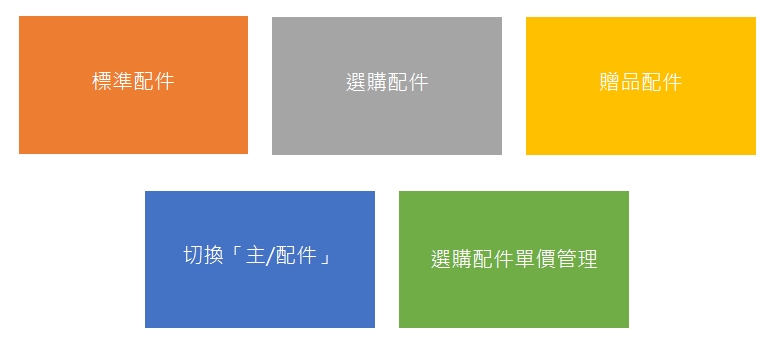 ☺可管理多層次【選配式】組合訂單。 ☺可挑選貨品欲搭配的組合配件:【標準件、選購件、贈品】 。 ☺可因應不同的客戶需求,設定組別代碼,管理其所選的配件。 ☺單據上可自行點選「切換主/配件」,並提供分組列印功能。