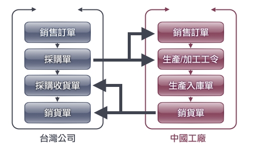 而台灣公司接下銷售訂單而產生採購單後,可自動轉開中國工廠的訂單,且可依中國工廠相關資料設定,設定是否一併產生生產工令/加工工令。中國工廠生產完工後,銷貨單可自動轉入為台灣公司的採購收貨單,中國工廠的Packing
