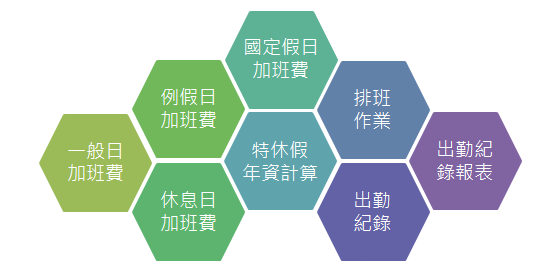 •【一般/例假日/休息日/國定假日】班次、上下班時間、工作時數管理。