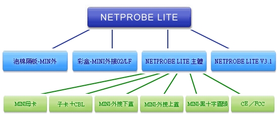 《NETPROBE LITE /LF》產品是由《NETPROBE LITE 主體》、《泡棉隔板-MIN外接》、《彩盒-MINI外接02/LF》、《NETPROBE LITE V3.1》所組成的,所以,《NETPROBE LITE /LF》是《NETPROBE LITE 主體》的母件;而《NETPROBE LITE 主體》是《NETPROBE LITE /LF》的子件。