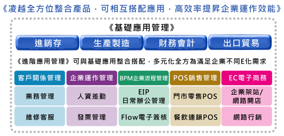 ERP•進銷存•會計軟體•生產製造•貿易軟體•人事薪資•差勤•電子發票•APP•BPM•EIP•Flow•POS