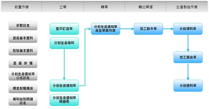 ☺管理原料以不同裁切方式產出不同產品的生產模式。適用:鋼鐵、塑膠射出、套管裁切、膠帶、紡織業… ☺使用「分割生產通知單」直接產生多張裁切/加工製令單。 ☺「最佳化裁切分條計算管理」最大化原材使用率。 ☺可設排刀分條的長度、重量、幅寬、損秏等公式,自動算出最省料的裁切方式。 ☺可管理每批分割產出的產品批號,以利追溯查詢原材料。 ☺可因應原材特性,採取「整批領料」以裁切出多個成品。 ☺裁切餘料如殘料、邊料,可退回倉庫進行管理,並平均分攤至各製令。