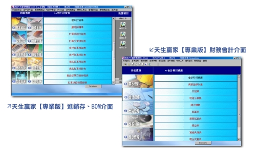 天生贏家【專業版】包含目前企業e化最渴求之進銷存貨、財務會計、生產製造BOM商軟,介面操作簡易,導入快速上線,簡繁中文化符合兩岸三地企業管理,不僅如此它並擁有單據完備審核及權限控管機制,讓企業便利管理同時可以嚴謹管控系統作業。此外還有如:進銷存單據同時可對應多張訂單控管、安全存量提醒、客戶帳款額度超額即時警示、多幣別匯率管理入帳、生產製造費用結算分攤、客戶同為廠商的應收帳與應付帳之單對單沖銷…等超多的新穎符合需求功能,如此令人嚮往心動的軟體功能設計,不僅縮短了企業各部門之營運操作時間,同時更藉由商軟的便利性,提昇了各部門之營運績效!