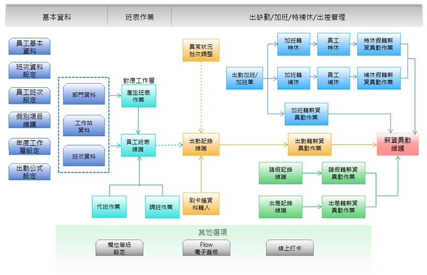 【凌越ERP】人事差勤系統,具備HR人力資源管理,針對員工出缺勤,提供健全完善的差勤管理機制,可依《勞基法一例一休》編列公司休假制度、設定公司上班日/例假日/休息日、依員工年資計算特休假天數,管理一例一休加班/排班/特休假/補休假、上下班時間、工作時數,輕鬆計算【一例一休】加班費,並提供一例一休加班轉補休假或加班轉薪資作業。亦可因應多班作業設定班次/班組,由系統自行產生班表,方便排班人員控管排班作業!此外,尚可依公司規定設立遲到/早退/加班出勤標準,由刷卡鐘轉入出勤,輕鬆即可掌握每一員工的出缺勤記錄。