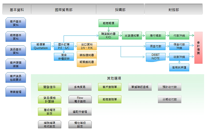 【凌越ERP】出口貿易軟體,提供最便利健全的出口貿易管理機制,提供【報價Quotation、P/I、S/C、P/O、嘜頭、包裝要求、混合併櫃安排、出貨通知、信用狀押匯、貨櫃船運、出口報關Invoice及Packing List、索賠管理】,並提供【報價利潤控管、佣金付款管理】,亦可搭配境外公司結合OBU運用【三角貿易或多角貿易管理】,輕鬆控管國際貿易事務。