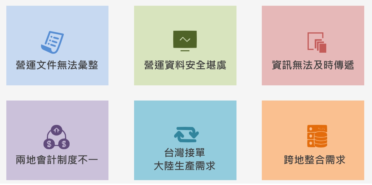 在大陸地區設立據點雖可享受低廉人工所帶來的低成本優勢,但兩地的幣值、語言介面體系、稅制,都不相同,對台灣總部的管理上,也因此產生了新的管理困擾及難題,而如何因應及處理兩地的營運模式所帶來的差異,這也是目前企業所持續在探討解決的重點管理之一。