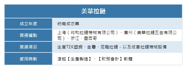 美華拉鏈向來以製作各項拉鍊及生產設備名聞海內外!美華拉鏈早期就採用凌越DOS版系統,深受美華拉鏈李老闆的肯定,除了本身採用之外,還熱情的介紹了不少企業友人使用。 之後,美華拉鏈為了能提高有效產能,開始向外尋求加工廠的配合,為了追求品質的一致性及準確掌控加工廠的庫存數目,亦希望將委外加工的部分也納入系統中一併管控!同時,由於美華拉鏈的成品及原物料以小體積為主,再加上業績成長擴張下,品項眾多,人員常要大費周章地進行物料盤點,但結果總因盤點數目過於繁多而出現錯誤的數值,因此也造成美華內部的不小困擾。於是美華拉鏈李老闆求助於當時已是台灣最優秀的商軟公司-凌越資訊,將原有系統升級成可進行多工廠資料整合的凌越【生產製造系統】。