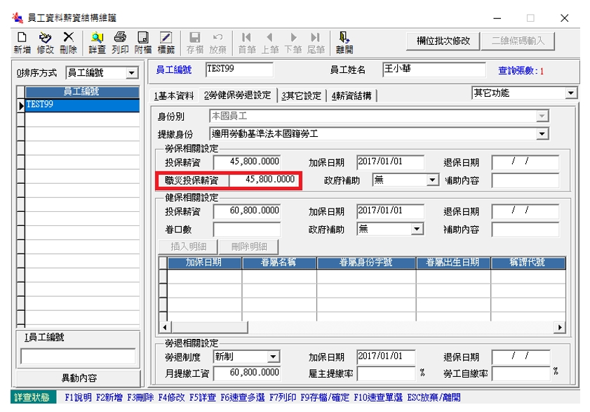 ●版本更新11105A(含)之後版本,基本資料 \ 員工薪資結構維護的【職災投保薪資】,一律預帶原本的【勞保投保薪資】級距。