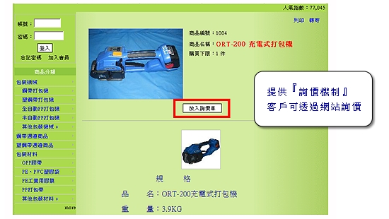提供『詢價機制』,當客戶看完產品介紹,有興趣進一步了解時,即可透過『詢價機制』與企業互動。 |