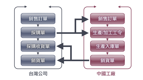 台灣接單大陸生產模式,多數因為大陸工廠有可能進行內銷,故需負擔相關營業銷售稅額,所以,可將大陸工廠視為唯一獨立採購供貨廠商,台灣公司則以採購模式進行。